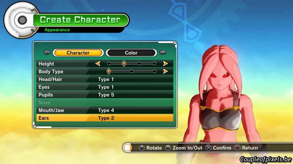 On peut choisir entre 5 races (Majins, Saiyens, Humains, Nameks et la race de Freezer). Pour les 3 premières races, on peut aussi choisir son sexe. L’outil de création de personnage ne fera pas date dans l’histoire du jeu vidéo mais est quand même assez puissant pour créer un personnage cohérent dans l’univers Dragon Ball. Vous constaterez d’ailleurs sur le screen du perso d’Aelya son goût prononcé pour le rose pétant…
