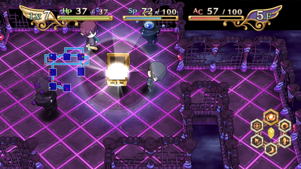 En effet, entre deux dialogues, il faut bien partir au combat : après tout on est en guerre ! Ainsi, chaque mission comprend au moins un donjon qu’il faut parcourir et terminer. Le style visuel des donjons diffère de celui de la partie visual novel : notre personnage et les ennemis apparaissent en SD (Super-Deformed), donnant un aspect mignon qui contraste un peu avec l’action.