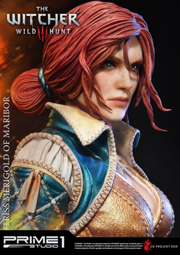 Le regard déterminé de Triss se marie bien avec sa posture : elle vient d’achever un monstre (représenté sur un socle fourmillant de détails) et s’apprête à en découdre à nouveau.